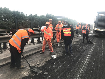 12月4日,難得的晴好天氣,甬臺溫高速公路臺州段一期路面專項養(yǎng)護(hù)攤鋪現(xiàn)場,工人緊張而忙碌作業(yè)。施工一旁,另有三位身著反光背心、頭戴帽子、腳穿布鞋的人員正目不轉(zhuǎn)睛地注視著攤鋪機(jī)作業(yè),時不時指點工作,他們是集團(tuán)路面專項養(yǎng)護(hù)綜合督查組成員邵克、馮濟(jì)爐和葉榮江。