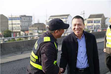 圖為集團副董事長、總經理張建平與督查組成員葉榮江握手 在施工現場,張建平對路面專項養護綜合督查組馮濟爐和葉榮江兩位同志說,你們就是公司的眼睛,要把握施工現場動態,把好施工質量和安全關;你們是公司的手,要督促工程保質保量快速推進。這是一次確立科學養護理念、鍛煉管養人才,展示公司硬實力的機會??粗@兩位老同志被陽光曬得黝黑的臉龐,張建平緊緊地握住他們的手,連聲對他們說:“你們辛苦了,你們辛苦了!”