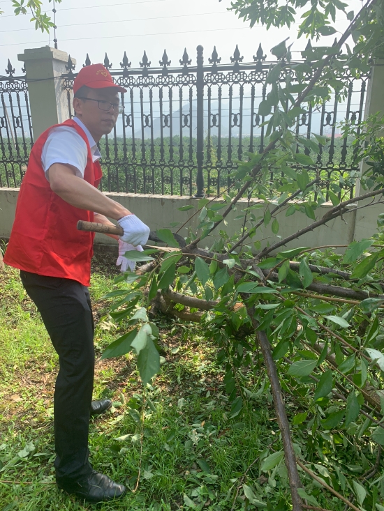 圖為志愿者合影 8月13日上午,該所志愿服務隊身穿統(tǒng)一紅色馬甲,積極投身到災后恢復工作中。 “把砍刀給我,我力氣大,讓我來。” 活動過程中,孫明偉、杜廣勝、楊堅等同志一行先查看了配電房周邊綠化帶,看到有樹木倒伏,壓在防護網上,存在較大安全隱患,他們二話不說立即手拿砍刀,對樹木進行切割處理,并由李學平、包德福等人安排拉車將斷木等清理干凈。