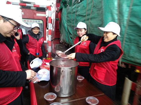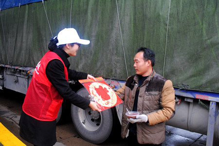 圖為志愿者給司機(jī)送上印有出入平安的“?!弊?/span> 按照傳統(tǒng),臘八節(jié)這天該喝上一碗?yún)R聚著五谷雜糧的臘八粥,可以在冬日暖身暖心,更是對寒冷歲末的美好祝愿。臺(tái)州收費(fèi)所提前幾天就采購好了制作臘八粥的材料:糯米、黑米、薏仁、紅豆、大白蕓豆、蓮子、紅棗、枸杞等,食材足足浸泡了一夜,食堂工作人員從凌晨四點(diǎn)便開始制作,足足熬煮三、四個(gè)小時(shí),熬出了四大鍋的臘八粥,出鍋的臘八粥濃稠軟糯、色香味俱佳。 在志愿服務(wù)現(xiàn)場,志愿者們個(gè)個(gè)身穿統(tǒng)一的紅背心,頭戴白色帽子,面帶微笑,在寒風(fēng)中迎送來往車輛,送上的不僅僅有臘八粥,還有暖心的姜茶,更有溫馨的祝福!