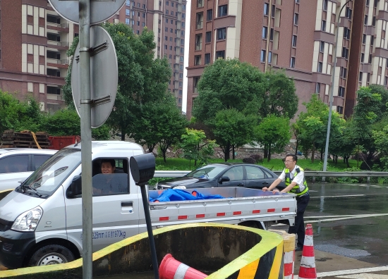 車輛故障拋錨 收費(fèi)員冒雨推行 7月4日中午12時(shí)30分左右,一輛牌照為浙開頭的五菱小貨車停在臺(tái)州收費(fèi)所出口5號(hào)車道安全島邊上許久未動(dòng),來往車輛紛紛避開該車道。當(dāng)班班長(zhǎng)郭斯泓發(fā)現(xiàn)這一情況后立即上前詢問,并在該車后放置隔離桶,提醒駕駛員打開雙閃燈。