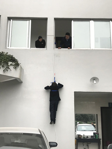 圖為高處逃生演練現(xiàn)場(chǎng) 理論培訓(xùn)結(jié)束后,溫嶺西收費(fèi)所隨即開展實(shí)地逃生演練,讓員工學(xué)習(xí)使用逃生繩從高處逃生的技能。在蔡教官的指導(dǎo)下,一名收費(fèi)員大膽地自我推薦,主動(dòng)嘗試此自救方法。 一切準(zhǔn)備就緒,該收費(fèi)員迅速爬上窗戶,利用逃生繩小心地沿著墻壁下滑,并順利落地。教官最后根據(jù)演練情況作點(diǎn)評(píng)。 此項(xiàng)技能有助于在火災(zāi)時(shí)多開辟一條逃生通道,減少人員傷亡。 通過(guò)此次全面的培訓(xùn)演練,溫嶺西收費(fèi)所將全力共抓消防安全工作,排除各類隱患。 鄭霞霞