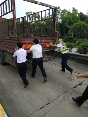 2018年5月27日,這本來是平凡普通的一天,可因為這件事,變成了不一樣的一天。 這一天,溫嶺西高速路收費員洪燈杰像往常一樣,在一號超寬車道旁的收費亭里工作。一輛綠色汽車剛走不久,卻發(fā)現(xiàn)后面一輛12軸型的小貨車停在那里,一動不動。洪燈杰心生疑惑,于是趕緊走出收費亭,到小貨車跟前查看。原來,這輛車剛走到收費站面前,便耗盡了電量,發(fā)動不了了。正在司機焦頭爛額之時,班長湯明漲和其他收費員吃飯回來,看見了這一幕。 湯明漲簡單地詢問了洪燈杰事情的經(jīng)過,本來準備等拖車,可是現(xiàn)在正是中午車輛高峰期,加上五號車道在施工,等拖車不合適。如果導致一號車道堵車,切換成ETC也緩解不了。考慮到這些問題之后,湯班長決定叫來幾個“大力士”,幫忙推車。