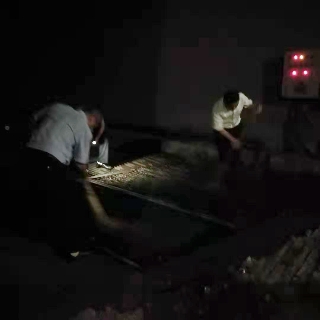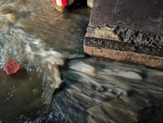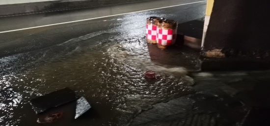 圖為車道水流 當(dāng)晚19:12分,黃土嶺隧道所中控員徐彤霞發(fā)現(xiàn)寧向隧道主車道路面出現(xiàn)積水,如不及時處置,路面濕滑會讓過往車輛打滑,嚴(yán)重影響隧道的安全暢通。為了杜絕安全隱患,管理所立即啟動防汛應(yīng)急方案,中控員第一時間在管理群發(fā)送現(xiàn)場圖片,并在同一時間通知執(zhí)勤隊與監(jiān)控中心。 執(zhí)勤隊員不顧狂風(fēng)暴雨趕赴現(xiàn)場,19:19分,斜井現(xiàn)場山上倒灌入隧道的水嘩嘩直流,儲水池水流急促,執(zhí)勤隊員立即分工合作,一組在主車道擺放安全錐采取防護措施,并利用沙包,堵住排水溝壁,使水盡量不往外滲,及時避免了積水對隧道內(nèi)行車造成的安全隱患。一組檢查潛水泵是否正常運行,查看積水入侵的原因、排水溝通暢情況。