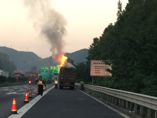 圖為事故現(xiàn)場(chǎng) 險(xiǎn)情就是命令,黃土嶺隧道所執(zhí)勤隊(duì)立即啟動(dòng)火災(zāi)應(yīng)急預(yù)案,迅速帶著滅火器趕赴現(xiàn)場(chǎng)。事故現(xiàn)場(chǎng),貨車(chē)車(chē)頂冒著火光,而且火勢(shì)越來(lái)越大,滅火器根本不可能撲滅大火。執(zhí)勤隊(duì)又迅速設(shè)置好安全警示標(biāo)志,配合交警人員實(shí)施臨時(shí)交通管制,并對(duì)事故路段的車(chē)輛進(jìn)行分流疏導(dǎo)。