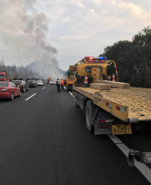 事態(tài)緊急,刻不容緩,清障車(chē)立即拉響警報(bào)預(yù)警,迅速提速超過(guò)事故車(chē),指引該車(chē)轉(zhuǎn)入應(yīng)急車(chē)道避免二次事故。由于該車(chē)運(yùn)載易燃品,天氣晴好,火勢(shì)借東風(fēng)迅速變猛,無(wú)法直接現(xiàn)場(chǎng)救援,事故車(chē)駕駛員已經(jīng)手忙腳亂。施救中心工作人員立即緊急上報(bào)指揮中心請(qǐng)求消防車(chē)支援。中心“2+1+n” 快速應(yīng)急模式隨即馬上啟動(dòng),17:30分在中心待命的施救車(chē)也到達(dá)現(xiàn)場(chǎng)配合預(yù)警,保持事故現(xiàn)場(chǎng)另一車(chē)道暢通,不影響其他車(chē)輛安全通行。 17:40分消防車(chē)到達(dá)現(xiàn)場(chǎng)滅火,18:15火滅,清障車(chē)帶事故車(chē)離開(kāi)現(xiàn)場(chǎng)。從發(fā)現(xiàn)到處置完畢僅1小時(shí),無(wú)人員傷亡,高速公路也一直保持安全暢通。 童軍偉