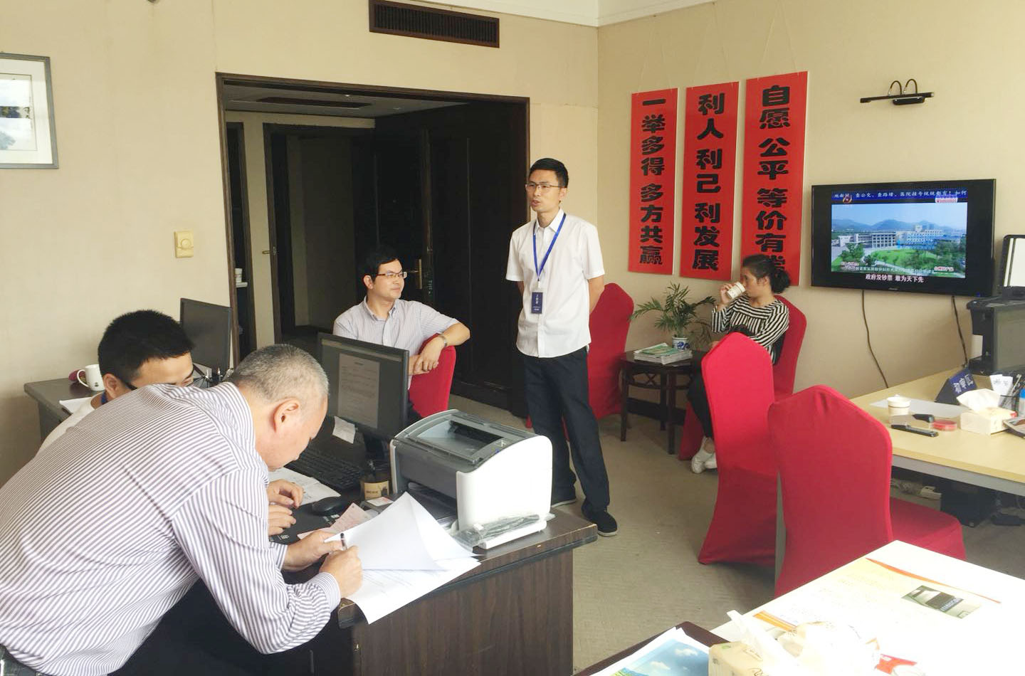 圖為臺州市政府副秘書長蘇元蓬走訪三門股權(quán)收購點(diǎn) 蘇元蓬一邊喝著茶水,一邊和大家拉起了家常。他是三門人,趁著國慶中秋假期回家探望親人,就來三門收購點(diǎn)走走,看望一下大家。 蘇元蓬回顧了市政府與集團(tuán)公司此次股權(quán)收購的前期準(zhǔn)備與工作動(dòng)員,并詳細(xì)詢問了公司目前的收購情況和三門點(diǎn)的收購進(jìn)度。工作人員介紹由于前期三門縣政府高度重視此次收購工作,特別是三門縣委常委、常務(wù)副縣長葉邦漢牽頭,召集全縣各機(jī)關(guān)單位、鄉(xiāng)鎮(zhèn)街道召開高速股權(quán)收購動(dòng)員會。在收購過程中,三門電視臺、三門報(bào)等媒體宣傳到位,各相關(guān)單位全力配合,縣里老領(lǐng)導(dǎo)帶頭轉(zhuǎn)讓,三門股權(quán)收購工作進(jìn)展順利。 “三門縣城里,你們有沒有做廣告宣傳?股東們是不是都知道了?”蘇元蓬問道。“有的,有的,這是我們公司準(zhǔn)備的公告海報(bào)。”工作人員林玲遞過一份海報(bào)。“我們打算節(jié)后張貼。”當(dāng)?shù)弥T收購點(diǎn)在對前來辦理轉(zhuǎn)讓的股東隨訪和電話問詢中,已確認(rèn)大多數(shù)股東都已知曉股權(quán)收購這個(gè)消息后,蘇元蓬大加贊賞。 蘇元蓬強(qiáng)調(diào),要強(qiáng)調(diào)此次股權(quán)收購對于企業(yè)轉(zhuǎn)型升級的重要意義,現(xiàn)場工作人員要耐心解釋,深入宣傳,特別是那些已經(jīng)辦理轉(zhuǎn)讓的股東,由他們口口相傳會更有說服力。對于國企法人股東,一定要借助政府的力量,由臺州市國資委與當(dāng)?shù)貒Y局共同推動(dòng),促成國企法人盡快轉(zhuǎn)讓,早日完成股權(quán)收購任務(wù)。 邵全森
