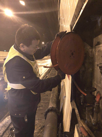 圖為檢查人員在檢查消防卷盤 大溪嶺隧道所負(fù)責(zé)人向來客介紹,隧道清洗工作需集團(tuán)下屬的施救中心、維養(yǎng)中心、隧道所員工,以及外協(xié)單位、養(yǎng)護(hù)公司等人員的積極配合,分工合作,將利用兩天時間完成大溪嶺雙向隧道的清洗維修任務(wù)。張金財再次稱贊表示,控制隧道清洗時間能有效地緩解地方交通壓力、節(jié)能減排。 2018年度春運(yùn)即將開始,各方檢查人員借此次隧道清洗機(jī)會,全面排查影響隧道暢通的安全隱患,做好隧道內(nèi)設(shè)備設(shè)施的維修保養(yǎng)工作,為創(chuàng)造平安節(jié)日提供保障。 陳智慧