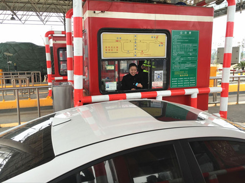 圖為工作人員在收費站外廣場引導(dǎo)車輛有序通行