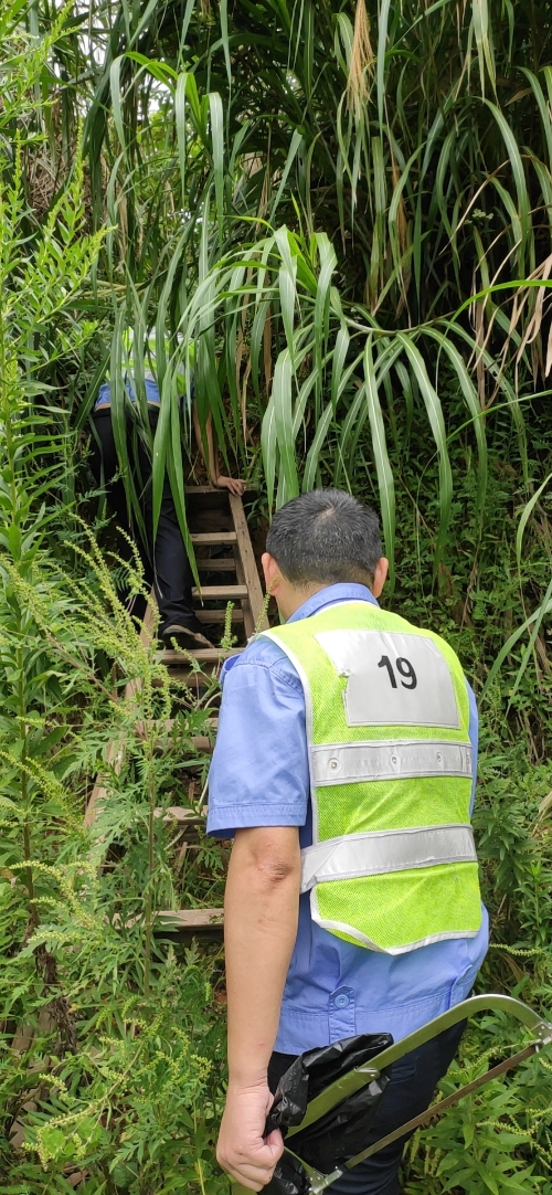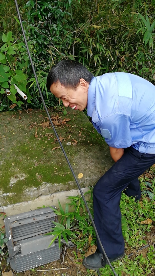 9月23日早上8點45分,中控員發(fā)現(xiàn)大溪嶺隧道北高位水池圖像模糊,照明燈不亮了。 為保障隧道消防安全,中控員對消防水池的水位需時時關注,萬一水池漏水無法及時查看,如遇火災,消防水供應不上,后果不堪設想。隊長意識到事情的嚴重性,即刻安排電工湯寧光和陳幸趕往北面山上的高位水池位置。初秋的山上植物茂盛,原來通往水池的小路早已淹沒在雜草間,隊員們提著工具,憑著記憶找小路,單手撥開雜草往山上走,到達高位水池之后,他們分工協(xié)作,一邊檢查線路,一邊抬開井蓋并下到水池檢查照明燈,經過檢查后發(fā)現(xiàn)只是線路有點松動,陳幸馬上對線路進行加固。